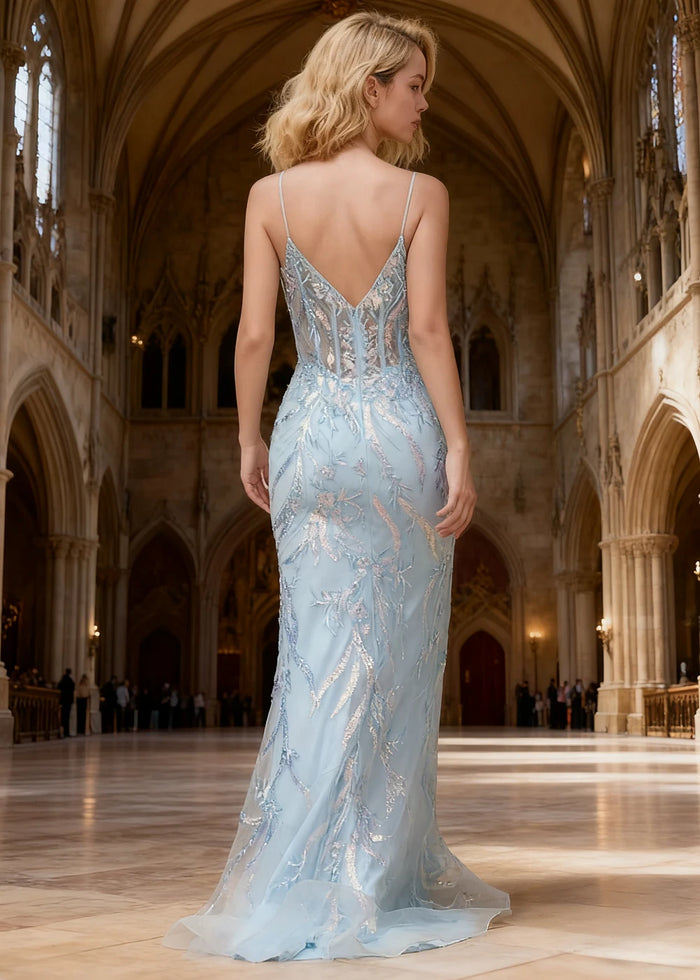 Check out this amazing aithea blue glitter prom dress. It's long and fits your body just right. The dress has a deep V-neck that looks very pretty. Shiny sequins cover the whole gown, making it sparkle like stars. The fabric is soft tulle, and it's fully lined inside for comfort. The back is open and sexy, with a corset style that makes your waist look small. A zipper at the back helps you put it on easily. It's perfect for proms, cocktail or special parties. You will feel beautiful and confident! Get this dress and have an unforgettable night.