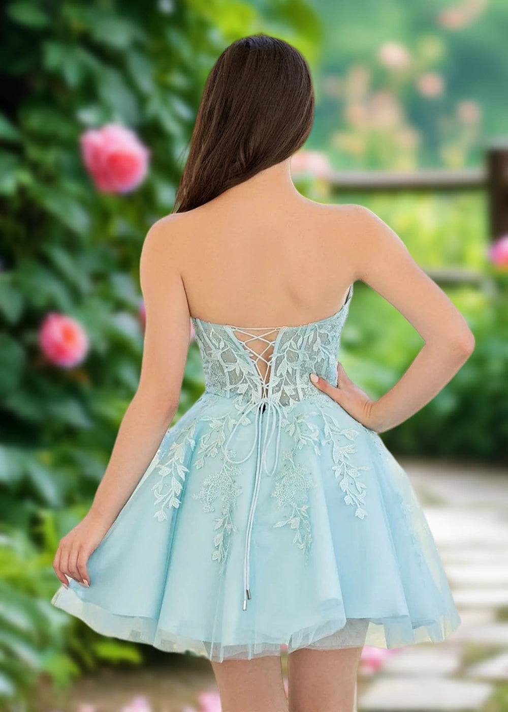 Elevate your homecoming look with our exquisite Turquoise Strapless Corset Homecoming Dress. The captivating turquoise hue offers a fresh, vibrant charm, perfect for making a statement. Designed as a strapless style, it highlights your shoulders and neckline, while the corset back with lace-up detailing ensures a flattering, customizable fit. Crafted from delicate lace and airy tulle, the dress combines intricate floral embroidery with a playful, flared silhouette. Priced to suit various budgets, it’s a fantastic blend of elegance and affordability. Plus, enjoy free shipping on select orders—your dream homecoming dress is just a click away!