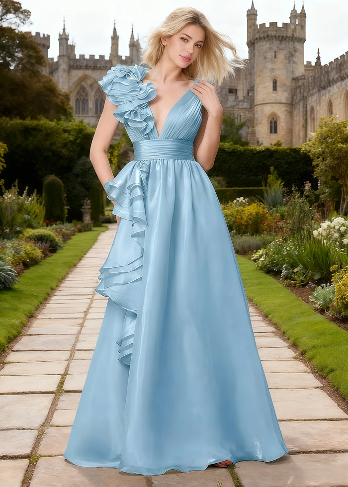 This gorgeous sky blue chiffon prom dress ruffles is perfect for your special night! It has a deep V-neck and is long enough to touch the floor. Made from soft satin-faced chiffon, it feels smooth and light. You'll love the pretty handkerchief ruffles on one shoulder and down the skirt. The dress is fully lined with built-in cups and boning for extra comfort and support. A hidden back zipper makes it easy to put on. Wear this stunning gown to your prom, black-tie wedding or any fancy party and feel like a star!