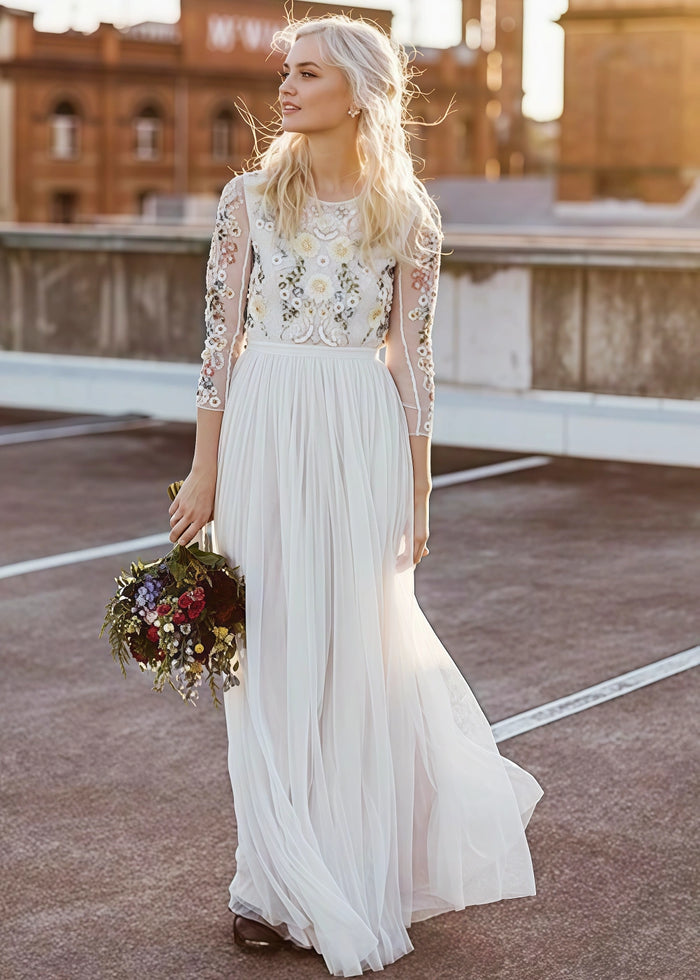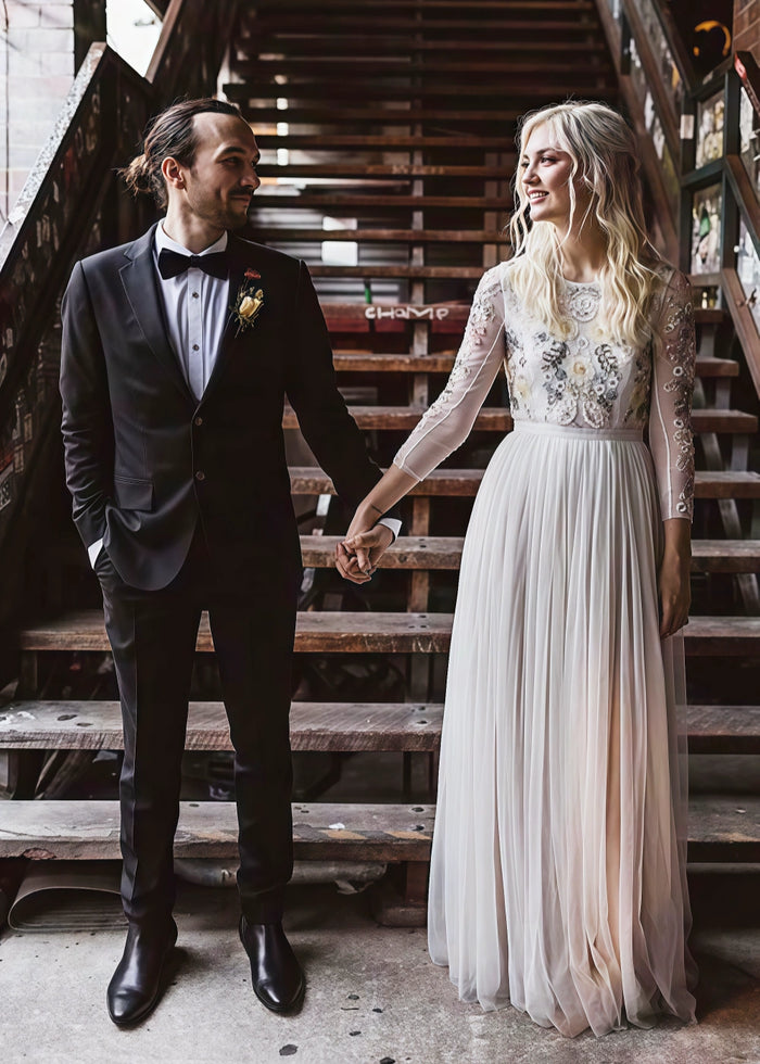 This wedding dress from PromDressClub is a true masterpiece. The top features delicate floral embroidery on sheer mesh sleeves, adding a touch of elegance and romance. The bodice's intricate details showcase the craftsmanship, making you the center of attention on your big day. A customer raved, "The embroidery is so detailed and beautiful, it made me feel like a princess!"