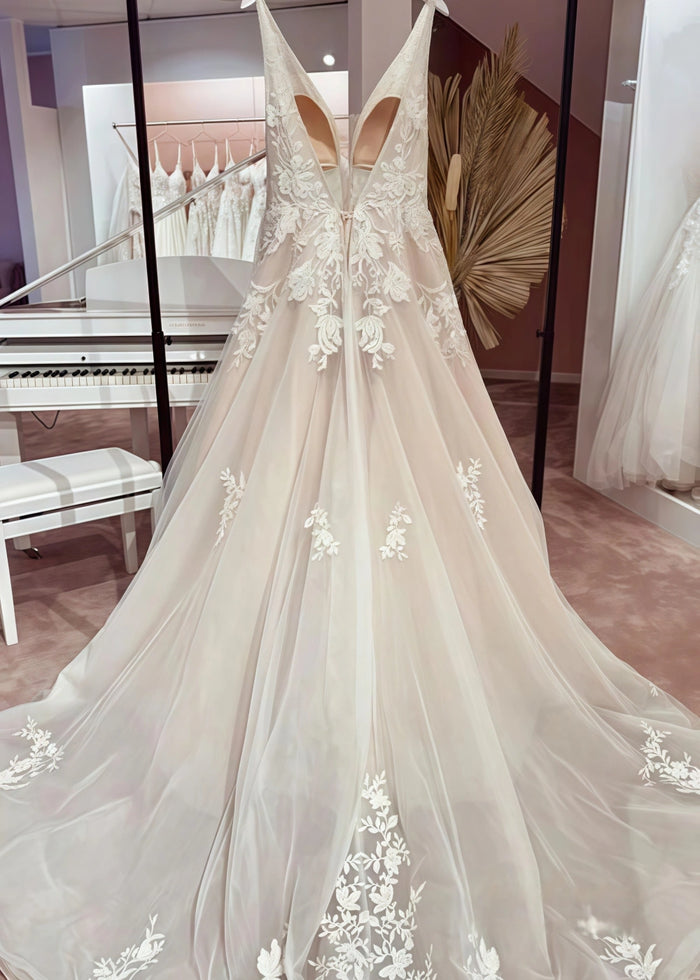 Crafted with the finest materials, this dress combines comfort and style. The lace is soft against the skin, while the tulle is lightweight and airy. Customers rave about how comfortable they feel in this dress throughout the long wedding day, without sacrificing an ounce of glamour.