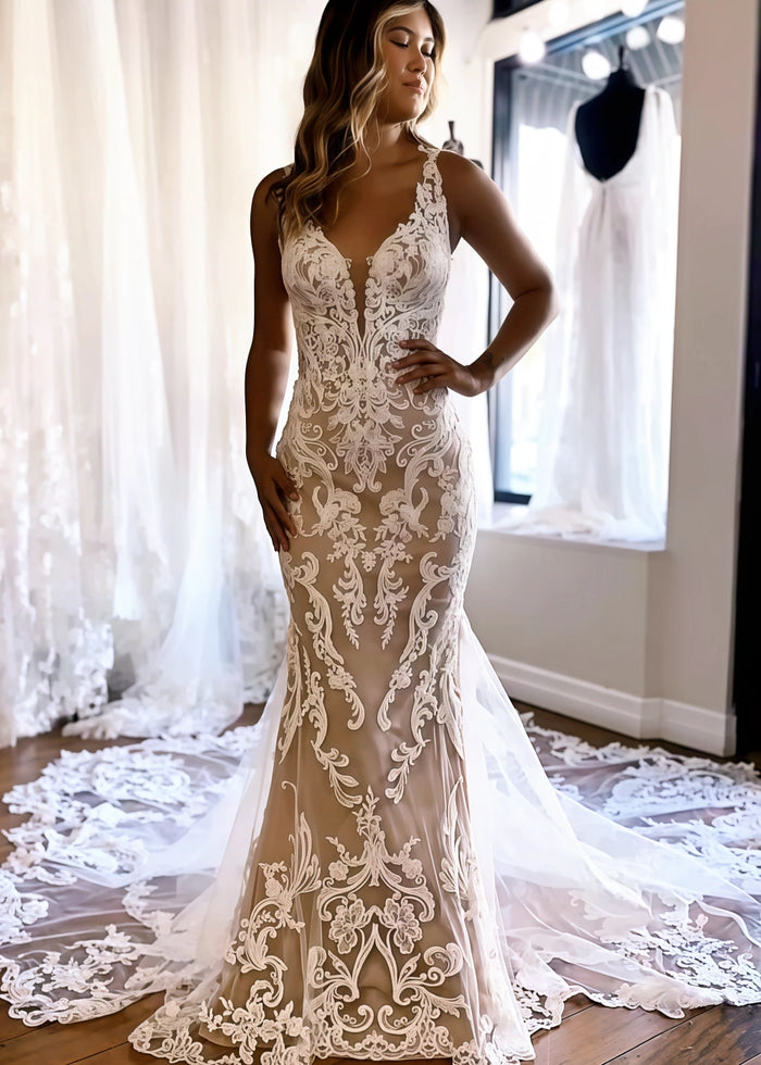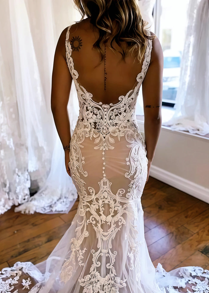 Are you dreaming of a stunning wedding look? Our mermaid - style lace wedding dress from PromDressClub is the perfect choice. This dress features a deep V - neck in the front and a breathtaking backless design, making it both elegant and alluring. The intricate lace patterns add a touch of luxury and sophistication, flowing seamlessly from the bodice to the long train.