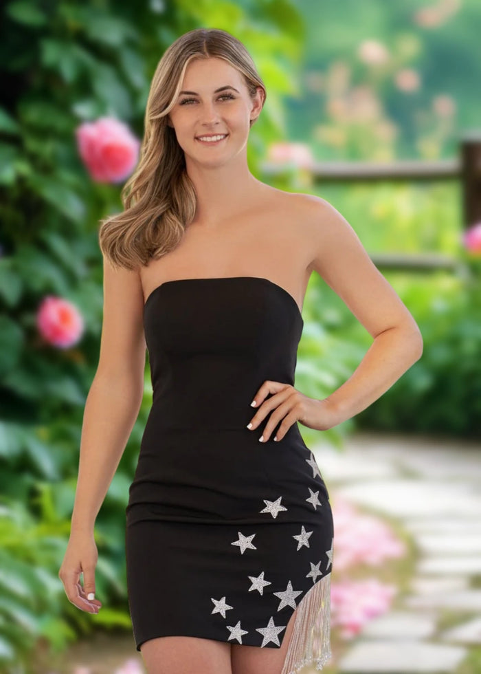 Elevate your party look with our stunning strapless cocktail dress! Crafted from soft, stretchy knit fabric, this black beauty features eye-catching beaded star details and trendy fringe accents. Beyond classic black, it also comes in vibrant red and sweet pink. The strapless design flatters your shoulders, while the lace-up back adds a flirty touch. Perfect for cocktails or special events, it’s priced from just $149. Plus, enjoy free shipping on select orders—grab your favorite color now!