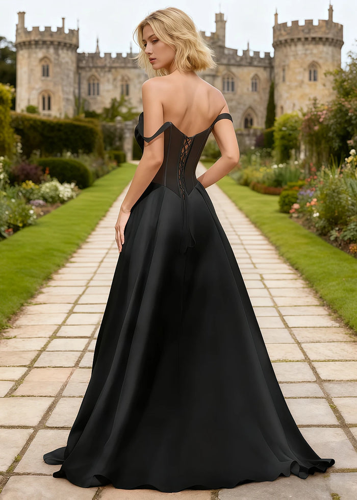 Meet your dream black satin prom dress corset! This beautiful black gown is both elegant and comfortable. The off-the-shoulder top has a corset style that fits you nicely. At the back, a lace-up design lets you adjust the dress for a perfect fit. The long skirt is made of shiny satin and light tulle, so it flows gracefully when you move. It also has a high slit to add a touch of charm. Plus, the dress is fully lined inside, making it soft against your skin. Ideal for proms, parties, or weddings, this dress will help you shine on your special night!