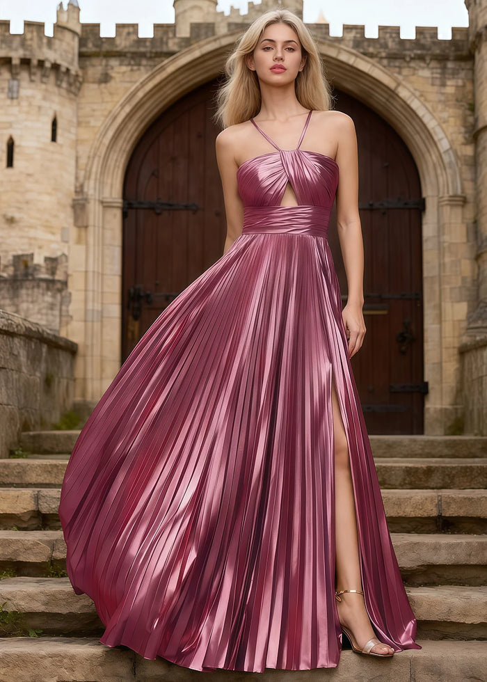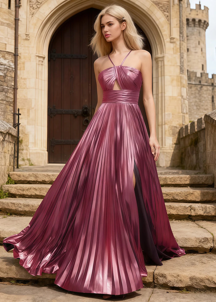 Look stunning in this beautiful metallic fuchsia prom dress! The dress has a thin strap design that is adjustable for comfort. The skirt is long and flowy with soft pleats that catch the light. A high slit adds a touch of boldness, showing off your leg when you move. The bodice features a modern cutout detail for a chic look. Inside, the dress is fully lined, so it feels smooth against your skin. A back zipper makes it easy to wear. This gown is perfect for proms, parties, or any special event. You will stand out and feel confident!